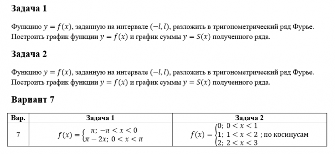 Задача 1 Функцию y=f(x), заданную на интервале (-l,l), разложить в тригонометрический ряд Фурье. Построить график функции y=f(x) и график суммы y=S(x) полученного ряда. Задача 2 Функцию y=f(x), заданную на интервале (-l,l), разложить в тригонометрический ряд Фурье. Построить график функции y=f(x) и график суммы y=S(x) полученного ряда. Вариант 7 Вар.Задача 1Задача 2 7f(x)={█(π; -π<x<0@π-2x; 0<x<π)┤f(x)={█(0; 0<x<1@1; 1<x<2@2; 2<x<3)┤ ;по косинусам .