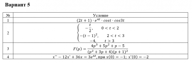 Задача 1 Найти изображение оригинала. Задача 2 Найти изображение оригинала. Задача 3 Найти оригинал изображения. Задача 4 Решить операционным методом задачу Коши для ДУ второго порядка Вариант 5 №Условие 1(2t+1)∙e^4t∙cost∙cos3t 2{█(-t/2,0<t<2@〖-(t-1)〗^2,2<t<3@-4,t>3)┤ 3F(p)=(〖4p〗^3+5p^2+p-5)/((p^2+3p+4)〖(p+1)〗^2 ) 4x``-12x`+36x=3e^6t,при x(0)=-1; x`(0)=-2 .