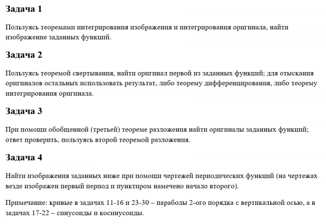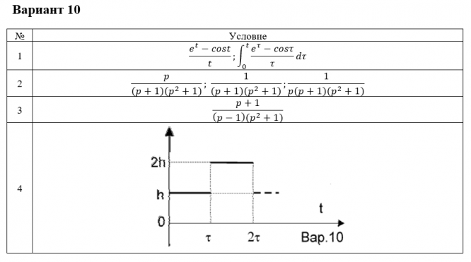 Задача 1 Пользуясь теоремами интегрирования изображения и интегрирования оригинала, найти изображение заданных функций. Задача 2 Пользуясь теоремой свертывания, найти оригинал первой из заданных функций; для отыскания оригиналов остальных использовать результат, либо теорему дифференцирования, либо теорему интегрирования оригинала. Задача 3 При помощи обобщенной (третьей) теореме разложения найти оригиналы заданных функций; ответ проверить, пользуясь второй теоремой разложения. Задача 4 Найти изображения заданных ниже при помощи чертежей периодических функций (на чертежах везде изображен первый период и пунктиром намечено начало второго). Примечание: кривые в задачах 11-16 и 23-30 – параболы 2-ого порядка с вертикальной осью, а в задачах 17-22 – синусоиды и косинусоиды. Вариант 10 №Условие 1(e^t-cost)/t;∫_0^t▒〖(e^τ-cosτ)/τ dτ〗 2p/((p+1)(p^2+1)); 1/((p+1)(p^2+1));1/(p(p+1)(p^2+1)) 3(p+1)/((p-1)(p^2+1)) 4.