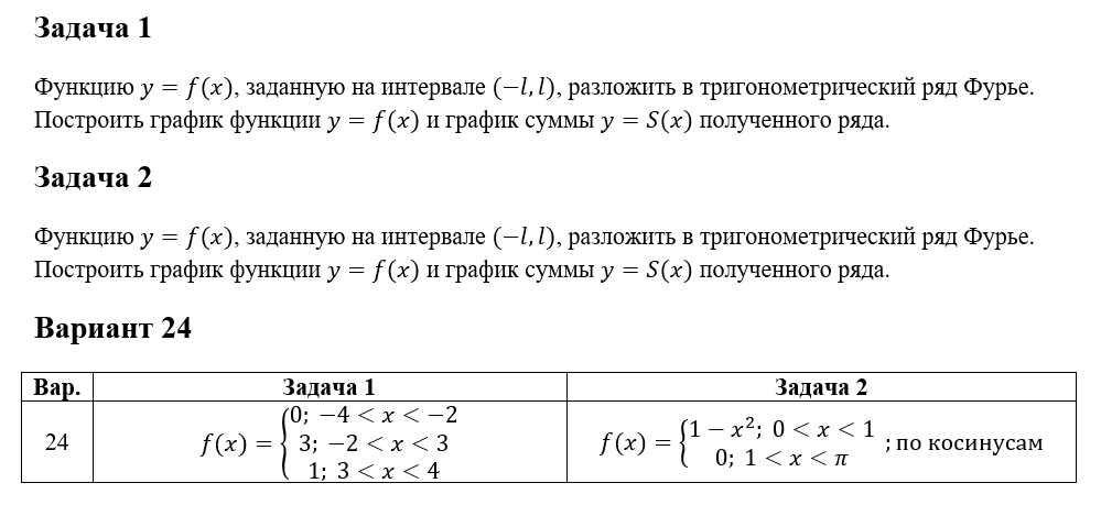 Задача 1 Функцию y=f(x), заданную на интервале (-l,l), разложить в тригонометрический ряд Фурье. Построить график функции y=f(x) и график суммы y=S(x) полученного ряда. Задача 2 Функцию y=f(x), заданную на интервале (-l,l), разложить в тригонометрический ряд Фурье. Построить график функции y=f(x) и график суммы y=S(x) полученного ряда. Вариант 24 Вар.Задача 1Задача 2 24f(x)={█(0; -4<x<-2@3; -2<x<3@1; 3<x<4)┤f(x)={█(1-x^2; 0<x<1@0; 1<x<π)┤ ;по косинусам .