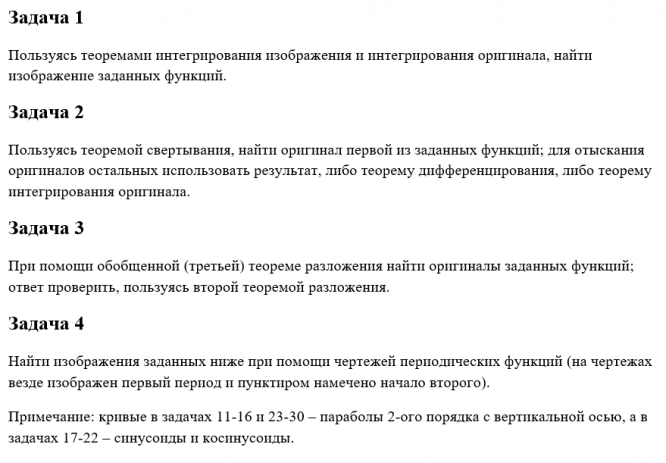 Задача 1 Пользуясь теоремами интегрирования изображения и интегрирования оригинала, найти изображение заданных функций. Задача 2 Пользуясь теоремой свертывания, найти оригинал первой из заданных функций; для отыскания оригиналов остальных использовать результат, либо теорему дифференцирования, либо теорему интегрирования оригинала. Задача 3 При помощи обобщенной (третьей) теореме разложения найти оригиналы заданных функций; ответ проверить, пользуясь второй теоремой разложения. Задача 4 Найти изображения заданных ниже при помощи чертежей периодических функций (на чертежах везде изображен первый период и пунктиром намечено начало второго). Примечание: кривые в задачах 11-16 и 23-30 – параболы 2-ого порядка с вертикальной осью, а в задачах 17-22 – синусоиды и косинусоиды.