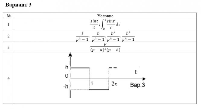 Вариант 3 № Условие 1 sint/t;∫_0^t▒〖sinτ/τ dτ〗 2 1/(p^4-1); p/(p^4-1);p^2/(p^4-1);p^3/(p^4-1) 3 p/(〖(p-a)〗^2 (p-b)) 4    .