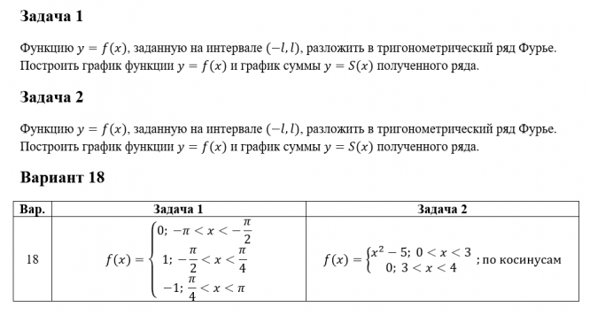 Задача 1 Функцию y=f(x), заданную на интервале (-l,l), разложить в тригонометрический ряд Фурье. Построить график функции y=f(x) и график суммы y=S(x) полученного ряда. Задача 2 Функцию y=f(x), заданную на интервале (-l,l), разложить в тригонометрический ряд Фурье. Построить график функции y=f(x) и график суммы y=S(x) полученного ряда. Вариант 18 Вар.Задача 1Задача 2 18f(x)={█(0; -π<x<-π/2@1; -π/2<x<π/4@-1; π/4<x<π)┤f(x)={█(x^2-5; 0<x<3@0; 3<x<4)┤ ;по косинусам .