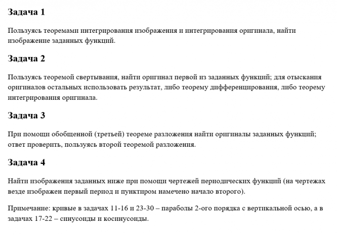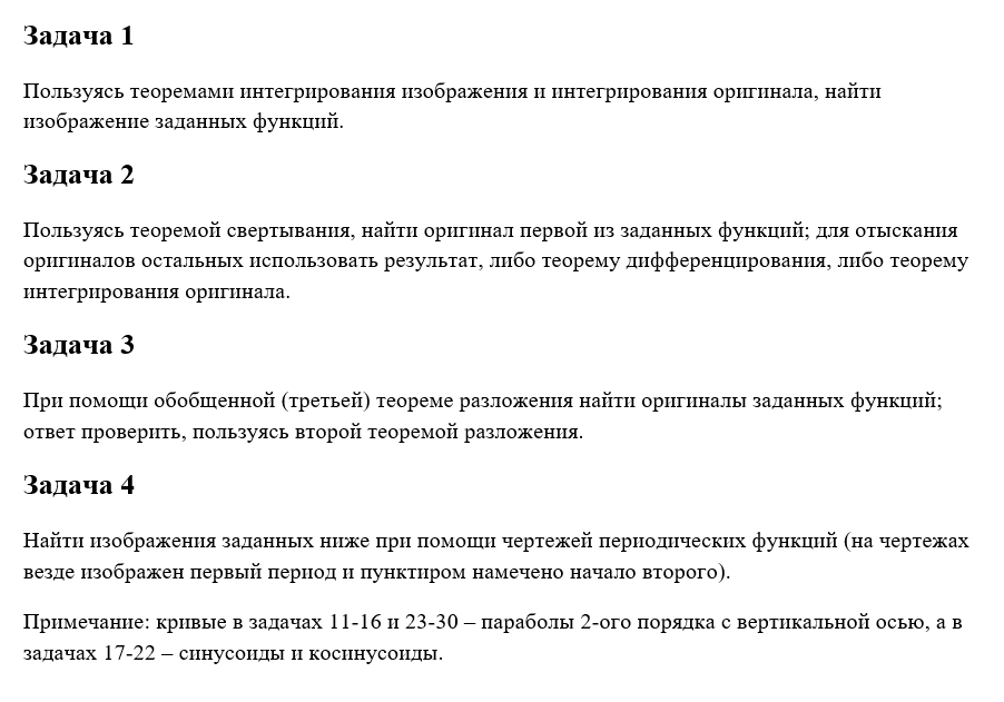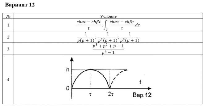 Задача 1 Пользуясь теоремами интегрирования изображения и интегрирования оригинала, найти изображение заданных функций. Задача 2 Пользуясь теоремой свертывания, найти оригинал первой из заданных функций; для отыскания оригиналов остальных использовать результат, либо теорему дифференцирования, либо теорему интегрирования оригинала. Задача 3 При помощи обобщенной (третьей) теореме разложения найти оригиналы заданных функций; ответ проверить, пользуясь второй теоремой разложения. Задача 4 Найти изображения заданных ниже при помощи чертежей периодических функций (на чертежах везде изображен первый период и пунктиром намечено начало второго). Примечание: кривые в задачах 11-16 и 23-30 – параболы 2-ого порядка с вертикальной осью, а в задачах 17-22 – синусоиды и косинусоиды. Вариант 12 №Условие 1(chαt-chβt)/t;∫_0^t▒〖(chατ-chβτ)/τ dτ〗 21/(p(p+1)); 1/(p^2 (p+1));1/(p^3 (p+1)) 3(p^3+p^2+p-1)/(p^4-1) 4.