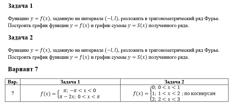 Задача 1 Функцию y=f(x), заданную на интервале (-l,l), разложить в тригонометрический ряд Фурье. Построить график функции y=f(x) и график суммы y=S(x) полученного ряда. Задача 2 Функцию y=f(x), заданную на интервале (-l,l), разложить в тригонометрический ряд Фурье. Построить график функции y=f(x) и график суммы y=S(x) полученного ряда. Вариант 7 Вар.Задача 1Задача 2 7f(x)={█(π; -π<x<0@π-2x; 0<x<π)┤f(x)={█(0; 0<x<1@1; 1<x<2@2; 2<x<3)┤ ;по косинусам .