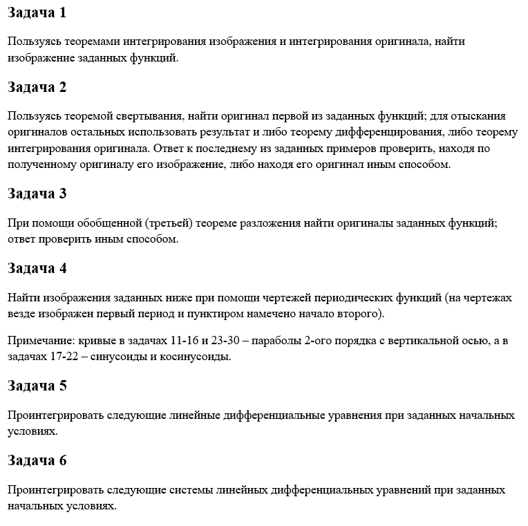 Задача 1 Пользуясь теоремами интегрирования изображения и интегрирования оригинала, найти изображение заданных функций. Задача 2 Пользуясь теоремой свертывания, найти оригинал первой из заданных функций; для отыскания оригиналов остальных использовать результат и либо теорему дифференцирования, либо теорему интегрирования оригинала. Ответ к последнему из заданных примеров проверить, находя по полученному оригиналу его изображение, либо находя его оригинал иным способом. Задача 3 При помощи обобщенной (третьей) теореме разложения найти оригиналы заданных функций; ответ проверить иным способом. Задача 4 Найти изображения заданных ниже при помощи чертежей периодических функций (на чертежах везде изображен первый период и пунктиром намечено начало второго).