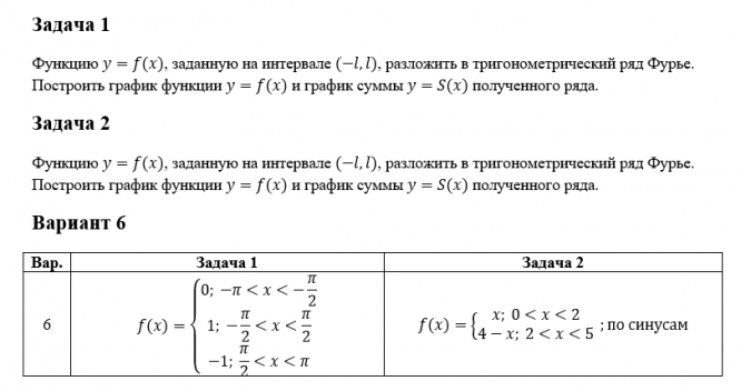 Задача 1 Функцию y=f(x), заданную на интервале (-l,l), разложить в тригонометрический ряд Фурье. Построить график функции y=f(x) и график суммы y=S(x) полученного ряда. Задача 2 Функцию y=f(x), заданную на интервале (-l,l), разложить в тригонометрический ряд Фурье. Построить график функции y=f(x) и график суммы y=S(x) полученного ряда. Вариант 6 Вар.Задача 1Задача 2 6f(x)={█(0; -π<x<-π/2@1; -π/2<x<π/2@-1; π/2<x<π)┤f(x)={█(x; 0<x<2@4-x; 2<x<5)┤ ;по синусам .