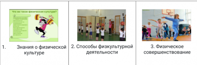 Выберите правильный ответ цифрой, соответствующей форме урока физической культуры: Задание 2. Физическая культура — обязательный учебный предмет на ступени начального общего образования, которая включает в себя разделы по приобретению знаний о физической культуре и спорте, по овладению основными видами физкультурно-спортивной деятельности, по совершенствованию основных двигательных навыков. Внимательно рассмотрите предложенные иллюстративные материалы и определите название раздела в рабочей программе дисциплины по физической культуре, в котором изучаются комплексы физических упражнений для утренней зарядки и физкультминуток. Выберите правильный ответ цифрой, соответствующей форме урока физической культуры: Вопрос 5 Обратите внимание! Перед вами комплексное задание, состоящее из трёх частей, в каждой из которых необходимо заполнить таблицу вписывая цифры, обозначающими правильные варианты ответов из предложенного перечня наименований и формулировок.