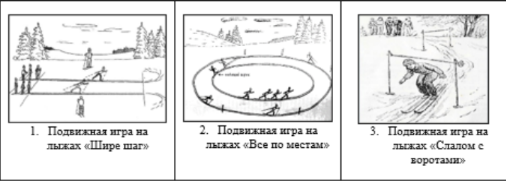 Внимательно рассмотрите графические иллюстрации и выберите только один вариант названия подвижной игры на лыжах, которая выступает комплексным средством физвоспитания на уроках лыжной подготовки младших школьников. В заключительной строке впишите цифрой только один правильный ответ.