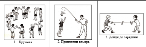 Задание 1. Элементарные подвижные игры, применяемые в начальной школе, не требуют от участников специальной подготовленности. Двигательные действия устанавливаются правилами игры, выполнение которых требует от играющих соответствующего инициативного поведения в пределах установленных правил. Внимательно рассмотрите рисунки и выберите только один вариант названия подвижной игры, которая наряду с обучением младших школьников основным видам движения (прыжкам), развитием координации движения и ловкости, способствует тренировке глазомера. В заключительной строке выберите цифрой только один правильный ответ. Выберите правильный ответ цифрой, соответствующей названию подвижной игры: Задание 2.