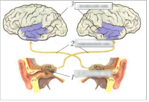 Рассмотрите топографию слухового анализатора. Установите соответствие отдела анализатора согласно обозначенной цифре путем перетаскивания слов к месту размещения.