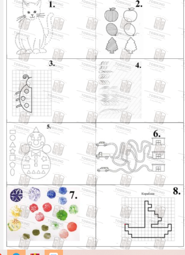 6 Выделение звуков, составляющих слово, и установление их последовательности 7 Неявное определение, раскрывающее содержание понятия путём непосредственного показа, ознакомления обучаемого с предметами, действиями и ситуациями, обозначаемыми данным понятием. В процессе подготовки детей к письму педагоги уделяют большое внимание выполнению воспитанниками графических упражнений: раскрашивание и штриховка, рисование по заданному контуру; обводка шаблонов, трафаретов и лекал; обводка печатных букв по контуру и их штриховка. Внимательно рассмотрите предложенный далее ряд иллюстраций и выделите упражнение, которое не направлено на развитие графических умений и навыков детей дошкольного возраста.