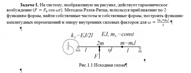 Задача 2. На систему, изображенную на рисунке, действует гармоническое возбуждение (). Методом Рэлея-Ритца, используя приближение по 2 функциям формы, найти собственные частоты и собственные формы, построить функцию амплитудных перемещений и эпюру внутренних силовых факторов для