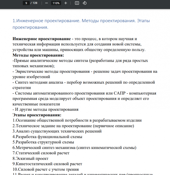 1.Инженерное проектирование. Методы проектирования. Этапы проектирования. Инженерное проектирование - это процесс, в котором научная и техническая информация используется для создания новой системы, устройства или машины, приносящих обществу определенную пользу. Методы проектирования: -Прямые аналитические методы синтеза (разработаны для ряда простых типовых механизмов); - Эвристические методы проектирования - решение задач проектирования на уровне изобретений - Синтез методами анализа - перебор возможных решений по определенной стратегии - Системы автоматизированного проектирования или САПР - компьютерная программная среда моделирует объект проектирования и определяет его качественные показатели - И другие методы проектирования Этапы проектирования: 1.Осознание общественной потребности в разрабатываемом изделии 2.Техническое задание на проектирование (первичное описание) 3.Анализ существующих технических решений 4.Разработка функциональной схемы 5.Разработка структурной схемы 6.Метрический синтез механизма (синтез кинематической схемы) 7.Статический силовой расчет 8.Эскизный проект 9.Кинетостатический силовой расчет 10.Силовой расчет с учетом трения 11.Расчет и конструирование деталей и кинематических пар (прочностные расчеты, уравновешивание, балансировка, виброзащита) 12.Технический проект 13.Рабочий проект (разработка рабочих чертежей деталей, технологии изготовления и сборки) 14.Изготовление опытных образцов 15.Испытания опытных образцов 16.Технологическая подготовка серийного производства 17.Серийное производство изделия 18.Эксплуатация и возможные ремонты 19.Утилизация 2. Классификация машин. Понятие о машинном агрегате Машина - техническое устройство, выполняющее преобразование энергии, материалов и информации с целью облегчения физического и умственного труда человека, повышения его качества и производительности. Виды машин: 1. Энергетические машины - преобразующие энергию одного вида в энергию другого вида. Эти машины бывают двух разновидностей: -Двигатели, которые преобразуют любой вид энергии в механическую -Генераторы ,которые преобразуют механическую энергию в энергию другого вида 2. Рабочие машины - машины использующие механическую энергию для совершения работы по перемещению и преобразованию материалов - Транспортные машины , которые используют механическую энергию для изменения положения объекта - Технологические машины ,использующие механическую энергию для преобразования формы, свойств, размеров и состояния объекта. 3. Информационные машины - машины, предназначенные для обработки и преобразования информации. -Математические машины , преобразующие входную информацию в математическую модель исследуемого объекта -Контрольно-управляющие машины , преобразующие входную информацию (программу) в сигналы управления рабочей или энергетической машиной. 4.Кибернетические машины - машины управляющие рабочими или энергетическими машинами, которые способны изменять программу своих действий в зависимости от состояния окружающей среды Машинным агрегатом называется техническая система, состоящая из одной или нескольких соединенных последовательно или параллельно машин и предназначенная для выполнения каких-либо требуемых функций. Обычно состав машинного агрегата: вигатель, передаточный ме