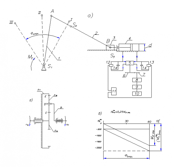 Предохранительные клапаны14 служат для сброса избыточного количества масла обратно в насос в случае, если давление в цилиндре 4 превысит расчетное. При повороте руля летательного аппарата (звено 1) на угол из одного крайнего положения (I) в другое (III) (рис.1а) на звено 1 действует момент сопротивления , зависимость которого от угла представлена графиком (,) (рис.1б).