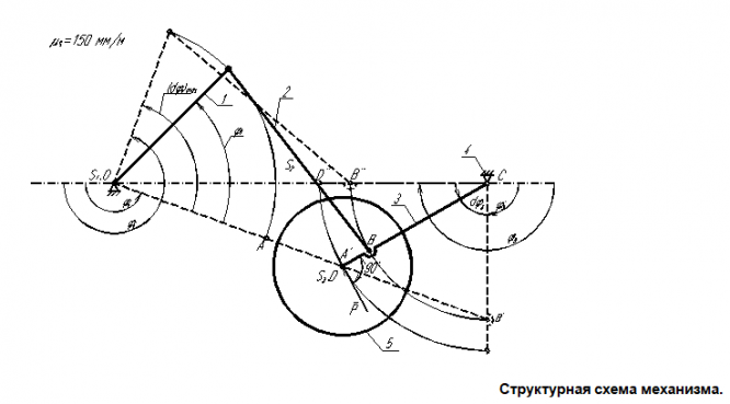 Синтез основного механизма (определение размеров звеньев 1, 2, 3) производится по двум положениям ведущего 1 и ведомого 3 звеньев, что является частным случаем синтеза шарнирного четырехзвенника по трем положениям этих же звеньев.