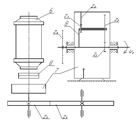 Опорный механизм предназначен для убирания и выпуска колес во время движения. Основной механизм (1-2-3-4) является двухкоромысловым четырехзвенником с колесом 5, центр которого расположен в точке D ведомого коромысла 3. Ведущее коромысло 1 приводится в движение от электродвигателя 6 (рис. 1) при помощи планетарного редуктора 7 и зубчатой передачи . Включение электромагнитной муфты 8, соединяющей при убирании и выпуске колес электродвигатель 6 и редуктор 7, производится посредством концевых выключателей ( на схеме не показаны).