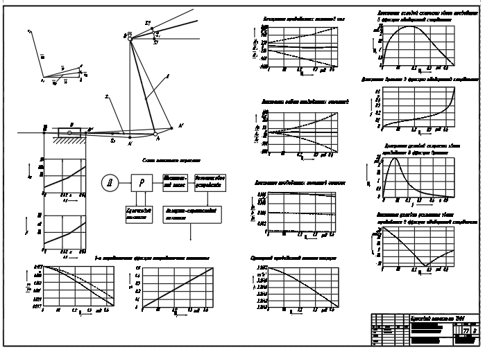 График зависимости перепада давлений в гидроцилиндре от перемещений поршня (в пределах от 0 до максимальной величины ) дан на рис. 1б; величина начального перепада давлений должна быть определена по условию безударного останова механизма после поворота руля на заданный угол из положения Ⅰ в положение Ⅱ. Руль жёстко связан с выходным звеном 1 рычажного механизма; нагрузка на него задана в виде зависимости момента сопротивления от угла поворота на рис. 1в.