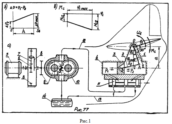 Гидравлический привод (рис. 1а) преобразует электрический сигнал управления в требуемое движения руля высоты летательного аппарата; он состоит из электродвигателя 5, планетарного редуктора 6-7-8-в, шестеренного насоса 9-10, гидродвигателя (гидроцилиндра) с рычажным (коромыслово-ползунным) механизмом 1-2-3-4 и золотникового устройства 11, регулирующего давление и расход жидкости в цилиндре 4.При перемещении (по сигналу управления) золотника 11 из среднего (нейтрального) положения вправо рабочая жидкость нагнетается насосом по напорной гидролинии 12 через открытое рабочее (дросселирующее) окно в левую полость цилиндра, а из правой полости по гидролинии 13 сливается в бак 14, откуда опять поступает в насос; поршень 3 перемещается вправо под действием перепада давлений рабочей жидкости в цилиндре. При движении управляющего золотника из среднего положения влево поршень 3 также перемещается влево.