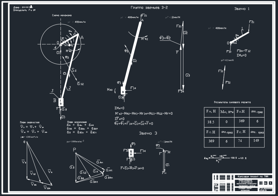 - 2.5.1. Для определения силы F34 необходимо рассмотреть 2 и 3 звенья вместе и записать сумму моментов относительно точки А: