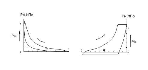 Рабочие процессы в цилиндрах , протекающие при различных значениях максимального давления РД > РК , соответствуют одному обороту коленчатого вала. При движении поршня 3 двигателя вниз происходит расширение продуктов сгорания и давление в цилиндре