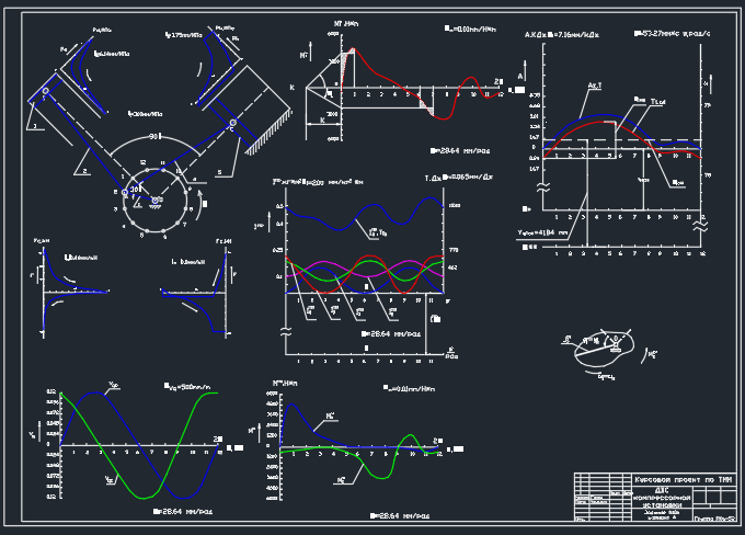 Расчетно-пояснительная записка состоит из 26 страниц,6 рисунков, 5 таблиц.Расчетно-пояснительная записка содержит динамический расчет двигателя передвижной компрессорной установки с учетом заданного коэффициента неравномерности вращения кривошипа d. Расчет включает определение закона движения основного механизма, силовой расчет основного механизма, расчет и исследование зубчатой передачи и планетарного механизма, расчет кулачкового механизма.