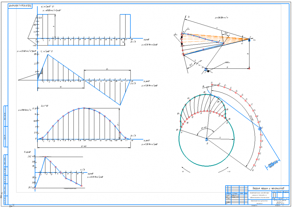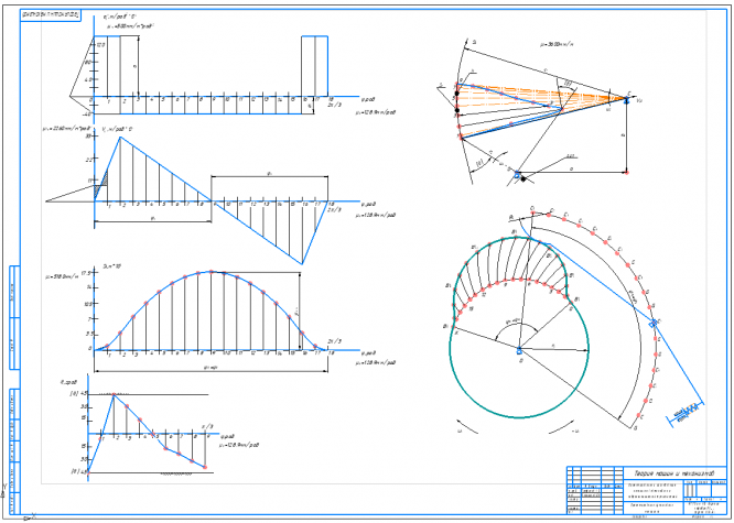 • На четвёртом листе определяется закон движения толкателя. Строится фазовый портрет, и определяются неизвестные параметры кулачка и толкателя, после чего выполняется построение профиля кулачка.