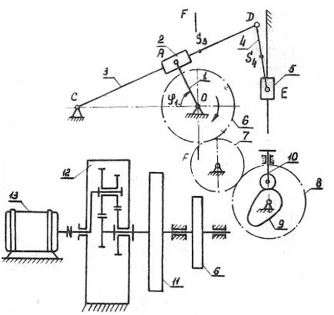 Брикетировочный автомат предназначен для прессования брикетов из различных материалов. Основный механизмом автомата является кулисный механизм (рис.1-‐1). Движение от электродвигателя 13 через планетарный редуктор 12 передается кривошипу 1. Камень 2, шарнирно связанный с кривошипом 1, скользит вдоль кулисы 3, заставляя кулису совершать возвратно-‐вращательное движение вокруг опоры С. Через шатун 4 движение передается ползуну 5, производящему прессование (брикетирование) материала. Диаграмма сил сопротивления, действующих на ползун 5 при прессовании представлена на рис. 1-‐2. Данные для построения указанной диаграммы приведены в табл.1-‐1.
