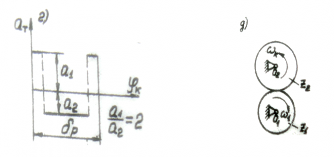 Вращение распределительному валу О2 передается от коленчатого вала О1 парой зубчатых колес (рис. 60д), передаточное отношение которой равно 2 ( i12=2 ).