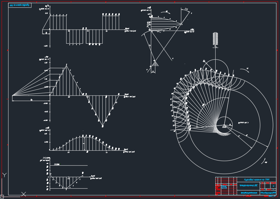 - В третьей части расчетно-пояснительной записки проектируется кулачковый механизм с поступательно движущимся толкателем, строятся графики ускорения, скорости и перемещения толкателя, фазовый портрет, определяются основные параметры кулачкового механизма, строится профиль кулачка, график зависимости угла давления от угла поворота кулачка.