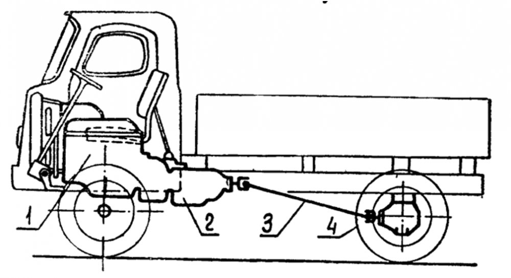 Колесный ход автомобиля (рисунок 1) состоит из силовой установки (двигатель 1 с маховиком) и трансмиссии, включающей муфту сцепления, коробку передач 2, карданный вал 3 с дифференциалом в ведущие колеса 4.