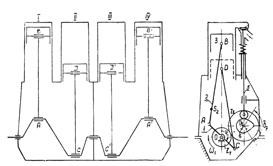 Рисунок 3 – Схема механизма двигателя и кулачкового привода клапанов