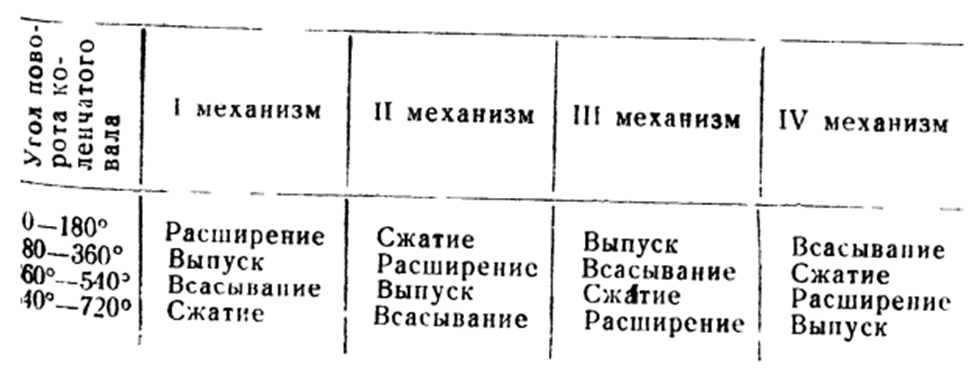 Порядок работы механизмов и чередование процессов в цилиндрах двигателя показаны в Таблице 1.