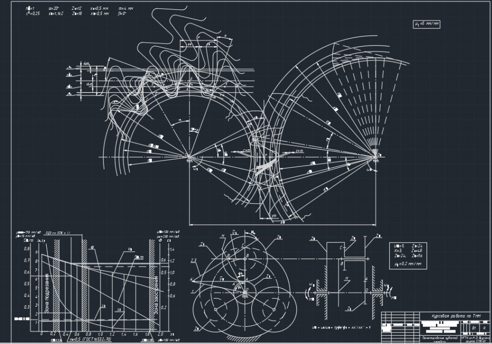 г) построение схемы зацепления зубчатых колес и обеспечение основных элементов колес передачи;