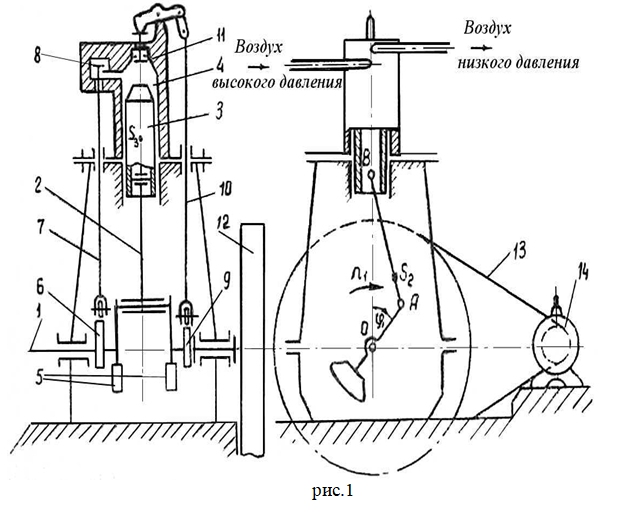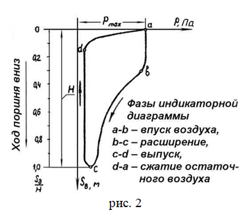 Детандер высокого давления (рис. 1)—вертикальная одноцилиндровая машина простого действия. Основным механизмом детандера является кривошипно-ползунный механизм, состоящий из коленчатого вала 1, шатуна 2 и поршня 3. Рабочее тело — воздух, сжатый до давления рmax, поступает в цилиндр детандера 4 через впускной клапан 8. При движении поршня вниз сжатый воздух расширяется, производя работу. Рабочий цикл детандера совершается за один оборот коленчатого вала. Изменение давления в цилиндре детандера в зависимости от положения поршня представлено индикаторной диаграммой (рис. 2), данные для построения которой приведены в табл.