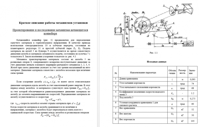 Расчетно–пояснительная записка к курсовому проекту “ Проектирование и исследование механизмов качающегося конвейера” содержит 65 страниц машинописного текста формата А4, 27 рисунков, 2 таблицы; курсовой проект выполнен на 4 листах формата А1.