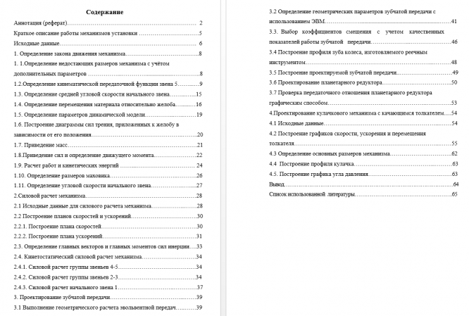 В расчетно-пояснительной записке приведены: проектирование механизма, определение закона движения звена приведения, силовой расчёт механизма, проектирование цилиндрической эвольвентной зубчатой передачи, проектирование двухрядного планетарного редуктора со смешанным зацеплением, проектирование кулачкового механизма с качающимся роликовым толкателем.