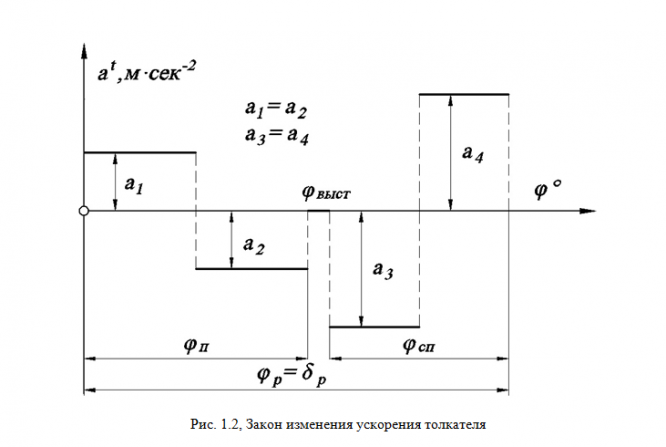 Кривошипно-коленный пресс (рис.1.1, а) предназначается для штамповки, холодной калибровки и чеканки. Высадочный (основной) механизм 1, 2, 3, 4, 5 является кривошипно-коромысловым. Коромысло 3 выполнено в виде шарнирного треугольника. Благодаря такой схеме рабочие скорости ползуна в конце хода малы, жесткость механизма пресса увеличивается. Коленчатый вал 1 высадочного механизма приводится в движение от электродвигателя 11 при помощи планетарного редуктора 12 и зубчатой передачи Z5, Z6. Маховик 10 размещен на валу 1 (рис. 1.1, б). Высадочный ползун 5 с закрепленным в нем пуансоном, совершая по вертикали возвратно-поступательное движение, осуществляет деформацию заготовки. Диаграмма усилий высадки представлена на рис. 1.1, в. Значения усилий высадки см. рис. 1.1, г. Подача заготовки производится при холостом ходе (вверх) ползуна 5. Механизм подачи состоит из кулачка 6, закрепленного на коленчатом валу 1, коромыслового толкателя 7 и тяги 8 с ползуном 9, снабженным приспособлением для подачи заготовки (рис. 1.1, а). Закон изменения ускорения толкателя см. рис. 1.2.