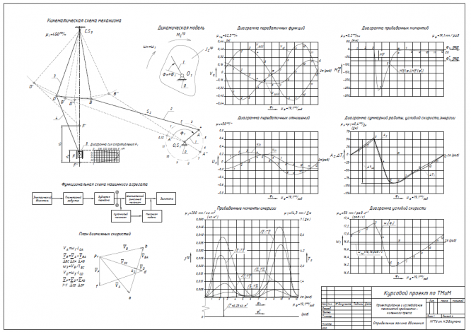 В пояснительной записке приведено: проектирование основного механизма кривошипно-коленного пресса, определение закона движения звена приведения, расчет дополнительной маховой массы, кинетостатический силовой расчет основного рычажного механизма, проектирование цилиндрической эвольвентной зубчатой передачи, проектирование двухрядного планетарного механизма, проектирование кулачкового механизма с силовым замыканием высшей пары.