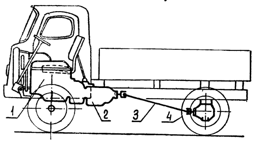 Колесный ход автомобиля (рис 1) состоит из силовой установки (двигатель 1 с маховиком) и трансмиссии, включающей муфту сцепления, коробку передач 2, карданный вал 3 с дифференциалом в ведущие колеса 4.