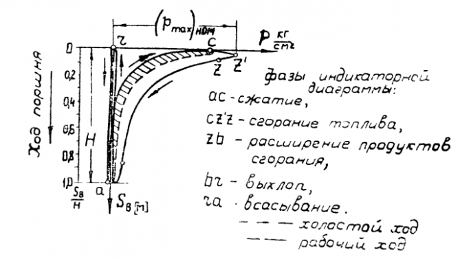 Различают два режима работы двигателя: 1) при холостом ходе, когда муфта сцепления выключена, и 2) при движении автомобиля (номинальный режим), когда муфта сцепления соединяет коленчатый вал с остальными механизмами автомобиля. Рабочий цикл в каждом цилиндре двигателя совершается за 2 оборота коленчатого вала и характеризуется индикаторной диаграммой, показывающей изменение давления газов в каждом цилиндре двигателя (рис 2). Сплошной линией очерчена индикаторная диаграмма номинального режима, пунктирно-индикаторная диаграмма холостого хода.
