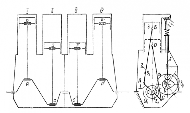 Основной механизм двигателя состоит из четырех одинаковых кривошипно-ползунных механизмов 1,2,3,4 расположенных в параллельных плоскостях 1,2,3,4, кривошипы которых размещены на одном коленчатом валу со сдвигом в 180 град (рис 3).