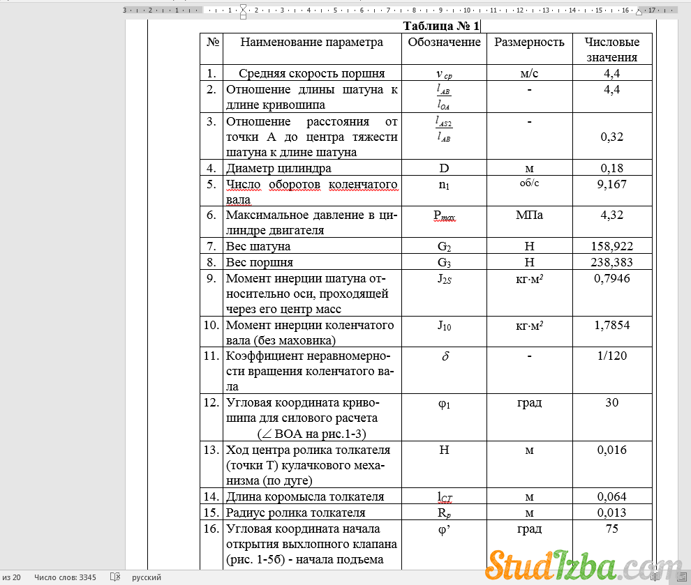 Буровая установка состоит из двигателя дизеля Д и бурового станка БС, связанных между собой клиноремённой передачей (рис. 1). При бурении движение колонны труб с буровым инструментом на конце осуществляется при помощи вращателя В, связанного с приводным шкивом станка системой зубчатых механизмов (рис. 2). Подъём бурового инструмента и труб из скважины и опускание их в скважину осуществляется при помощи лебёдки Л (рис. 1). Двигатель дизеля представляет собой одноцилиндровую, вертикальную, двухтактную машину, основным механизмом которой является кривошипно-ползунный (рис. 3). Продолжительность цикла работы двухтактного двигателя соответствует одному обороту его коленчатого вала. Изменение давления газа на поршень в процессе движения поршня представлено индикаторной диаграммой (рис. 4), данные, для построения которой приведены в табл. 2.