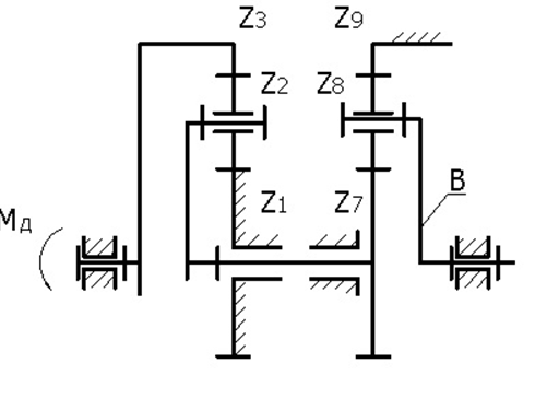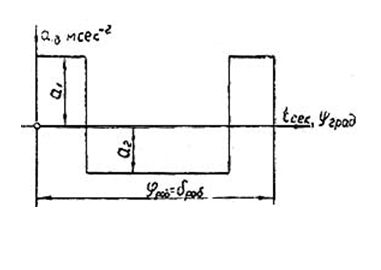 рис. 4Качающийся толкатель 12 имеет ускорение, которое изменяется по закону, представленному на рис. 4. Работа клапанов строго увязана по фазам с вращением коленчатого вала, угловая скорость которого в два раза больше угловой скорости кулачкового вала. Движение каждому ведущему колесу автомобиля передаётся от дифференциалов через карданный вал 18 и зубчатую передачу 19-20 ( рис. 5 ). Планетарная коробка скоростей обеспечивает получение четырёх скоростей и задний ход. 1-я передача, кинематическая схема которой представлена на рис. 6, состоит из колёс 3-2-1-7-8-9 и водила в, образующих сдвоенный планетарный механизм. Передаточное отношение коробки передач в этом случае Uк=U3B=U37U7B