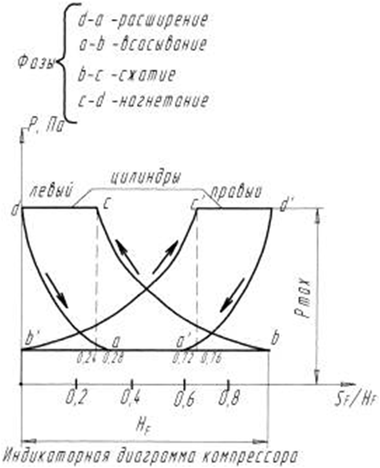 Горизонтальный двухцилиндровый кислородный компрессор простого действия (рис. а) предназначен для наполнения газообразным кислородом снятых с самолета баллонов и парашютных кислородных приборов. Баллоны заряжаются кислородом до необходимого давления Pmax [Па] путем перепуска и последующего перекачивания газа из аэродромных кислородных баллонов.