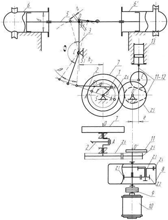 Основным механизмом компрессора является шестизвенный шарнирно-рычажной механизм. Он состоит из коленчатого вала 1, шатуна 2, углового рычага 3, шатуна-серьги 4, плунжера 5 с двумя поршнями и двух цилиндров 6, 6'. Коленчатый вал 1 приводится в движение асинхронным электродвигателей 10 через упругую муфту 9, планетарный редуктор 8 и зубчатую передачу Z5, Z6. Для обеспечения движения механизма с заданной неравномерностью на коленчатом валу компрессора помещен маховик 7. Смазка механизма осуществляется от масляного насоса, плунжер которого приводится в движение от кулачка 11, закрепленного на валу зубчатого колеса Z5. Схема кулачкового механизма 11-12 масляного насоса 13 представлена на рис. а, закон изменения ускорения плунжера насоса (толкателя -11) - следует выбрать из представленных. Изменение давления по перемещению поршней в цилиндрах 6, 6' компрессора характеризуется индикаторными диаграммами (рис. б), данные для построения которых приведены в табл. 2.