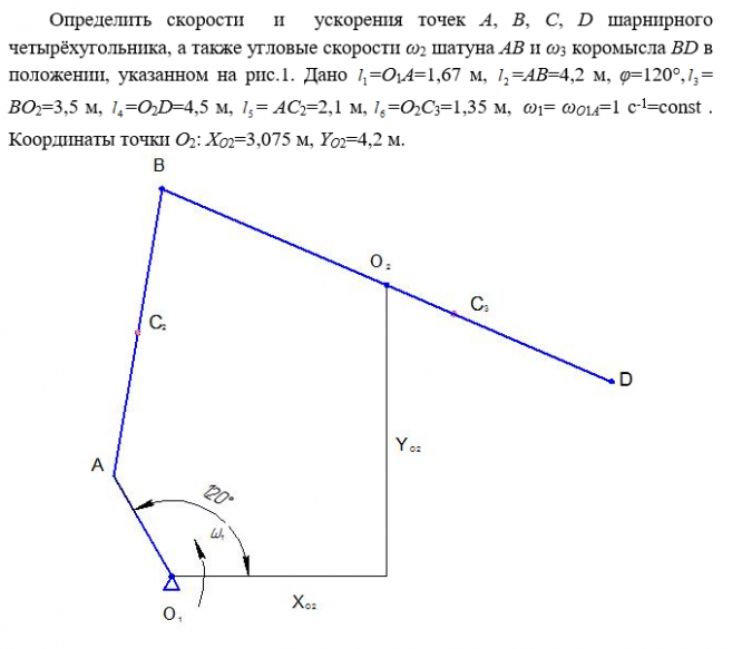 Определить скорости и ускорения точек А, В, С, D шарнирного четырёхугольника, а также угловые скорости ω2 шатуна АВ и ω3 коромысла ВD в положении, указанном на рис.1. Дано =О1А=1,67 м, =АВ=4,2 м, φ=120°,= ВО2=3,5 м, =О2D=4,5 м, = АC2=2,1 м,=О2С3=1,35 м, ω1= ωО1А=1 с-1=const . Координаты точки О2: XO2=3,075 м, YO2=4,2 м.
