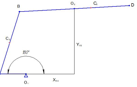 Определить скорости и ускорения точек А, В, С, D шарнирного четырёхугольника, а также угловые скорости ω2 шатуна АВ и ω3 коромысла ВD в положении, указанном на рис.1. Дано =О1А=0,295 м, =АВ=0,840 м, φ=180°,= ВО2=0,740 м, =О2D=0,740 м, = АC2=0,420 м,=О2С3=0,222 м, ω1= ωО1А=1 с-1=const . Координаты точки О2: XO2=0,6787 м, YO2=0,840 м