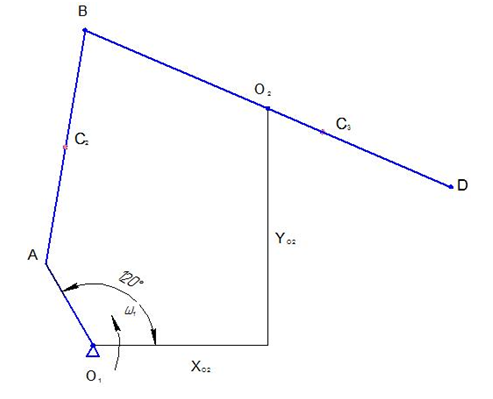 Определить скорости и ускорения точек А, В, С, D шарнирного четырёхугольника, а также угловые скорости ω2 шатуна АВ и ω3 коромысла ВD в положении, указанном на рис.1. Дано =О1А=0,57 м, =АВ=1,43 м, φ=120°,= ВО2=1,2 м, =О2D=1,2 м, = АC2=0,715 м,=О2С3=0,36 м, ω1= ωО1А=1 с-1=const . Координаты точки О2: XO2=1,056 м, YO2=1,43 м.