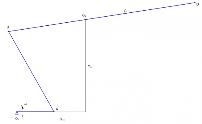 Определить скорости и ускорения точек А, В, С, D шарнирного четырёхугольника, а также угловые скорости ω2 шатуна АВ и ω3 коромысла ВD в положении, указанном на рис.1. Дано =О1А=1 м, =АВ=2,5 м, φ=0°,= ВО2=2,1 м, =О2D=3 м, = АC2=1,25 м,=О2С3=1 м, ω1= ωО1А=1 с-1=const . Координаты точки О2: XO2=1,8466 м, YO2=2,5 м.